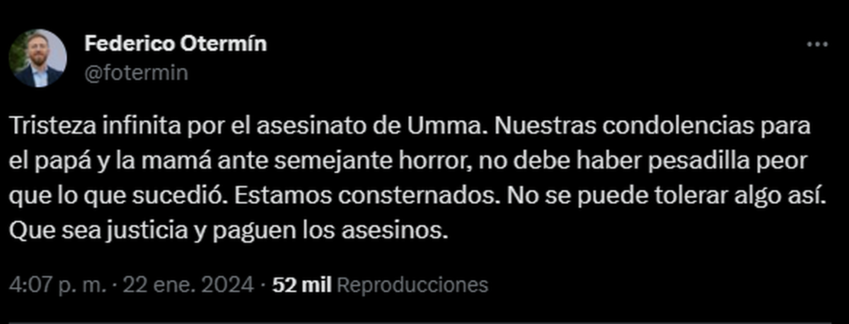 "Tristeza infinita por el asesinato de Umma. Nuestras condolencias para el papá y la mamá ante semejante horror, no debe haber peor pesadilla que lo que sucedió. Estamos consternados. No se puede tolerar algo así. Que sea justicia y paguen los asesinos", escribió el jefe comunal del distrito que albergó este hecho trágico hecho de inseguridad.