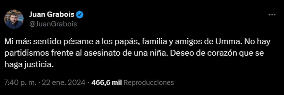 Quién también se hizo eco de lo ocurrido es Juan Grabois, dirigente social y político ex candidato a presidente en las PASO 2023 por el frente de Unión por la Patria. "Mi más sentido pésame a los papás, familia y amigos de Umma. No hay partidismos frente al asesinato de una niña. Deseo de corazón que se haga justicia", escribió en su cuenta de X.