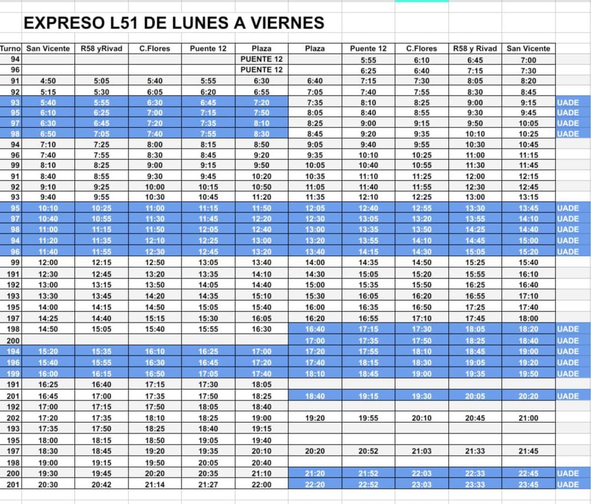 La línea 51 Expreso que conecta San Vicente con Constitución modificó sus horarios de verano de lunes a viernes. El servicio semi rápido, que une a la localidad con Capital Federal a través de la Ruta 58, Canning y la autopista Riccheri, comenzó a operar con una nueva grilla horaria que ya fue difundida para los días hábiles y volvieron los recorridos hasta UADE.